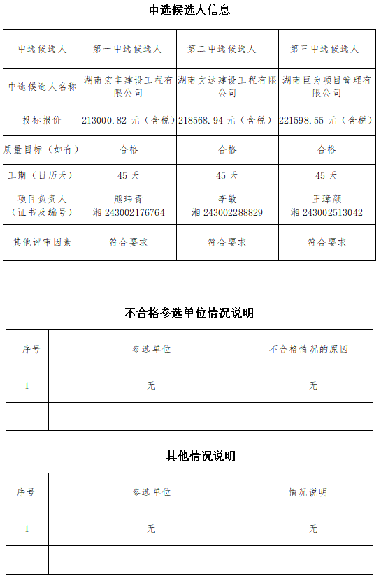 永州分公司涉水檢驗(yàn)設(shè)施建設(shè)工程 于2025年9月25日在永州市冷水灘區(qū)長(zhǎng)豐集團(tuán)辦公樓二樓評(píng)標(biāo)室進(jìn)行了比選開標(biāo)、評(píng)標(biāo)活動(dòng),評(píng)標(biāo)委員會(huì)按照比選文件及相關(guān)法律法規(guī)規(guī)定進(jìn)行評(píng)審,推薦以下三名中選候選人(排序),現(xiàn)將相關(guān)信息予以公示。